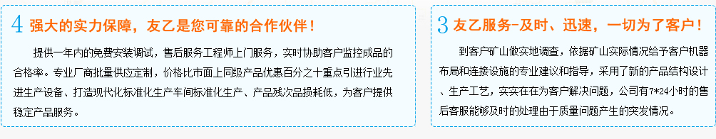 重慶友乙礦山機(jī)械設(shè)備有限公司自九十年代成立以來(lái),專(zhuān)業(yè)從事二級(jí)破碎機(jī)的研制、開(kāi)發(fā)和生產(chǎn),先后獲得國(guó)家專(zhuān)利數(shù)項(xiàng)。產(chǎn)品遍及全國(guó)各地,用戶(hù)過(guò)千家。 本公司生產(chǎn)的機(jī)械能夠按要求將石料破碎成所需石材,產(chǎn)量大、節(jié)電力、易維修保養(yǎng)、投資小、易安裝、見(jiàn)效快,是開(kāi)山采石、加工石子的理想機(jī)械,也可以按用戶(hù)要求加工訂做設(shè)備!罢\(chéng)信為本,科技為本,用戶(hù)至上,信譽(yù)”是我們的宗旨!“服務(wù)周到、全面、及時(shí)”是我們的承諾!讓客戶(hù)用的“省心、放心、舒心、貼心”是我們的追求!重慶友乙礦山機(jī)械設(shè)備有限公司期待和你精誠(chéng)合作,共創(chuàng)美好明天!